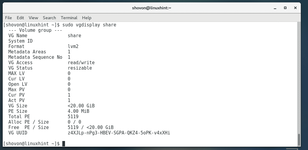 You can display more information about any specific VG, such as share with the following command:
