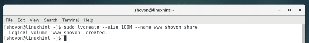 You can create a 100MB LV www_shovon from VG share with the following command: