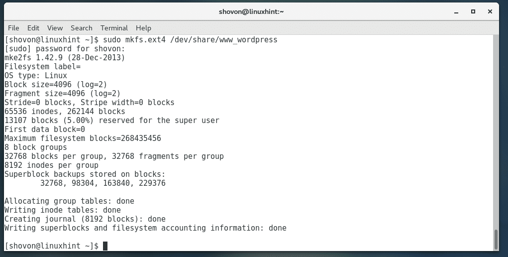 Run the following command to format /dev/share/www_wordpress LV to EXT4 filesystem: