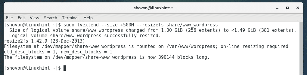 For example, to add 500MB more to our LV www_wordpress created from VG share, run the following command: