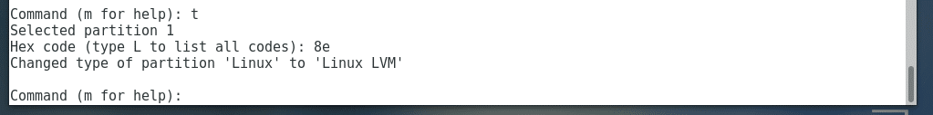 Now type in t and press <Enter>. Then type in 8e as the Hex code and press <Enter>. The partition type should be set to Linux LVM.
