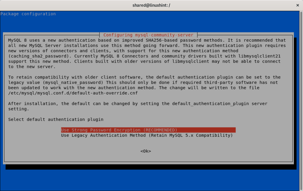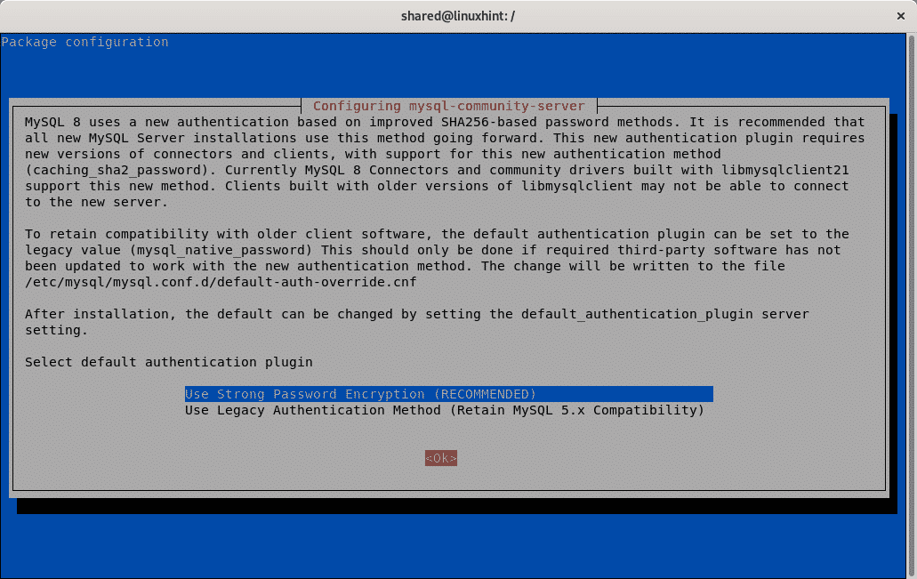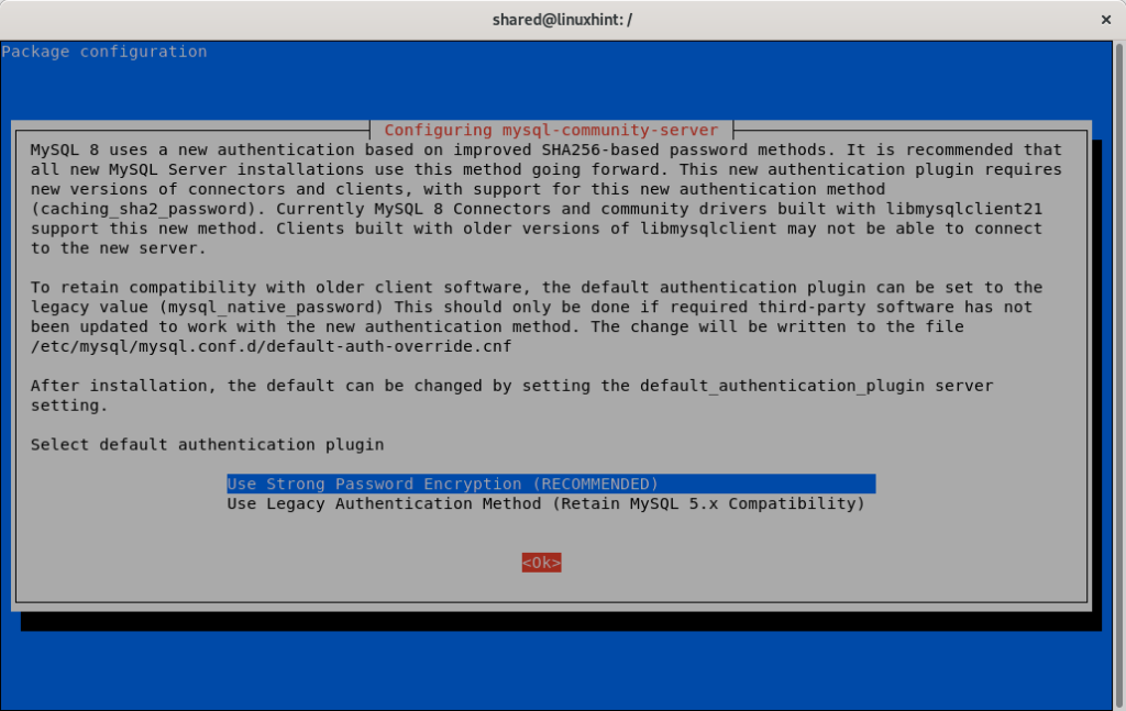 Decide if you want to increase Mysql encryption to leave it compatible with old Mysql client versions and proceed, if you don’t need compatibility with old Mysql versions leave the default option and select OK to continue.