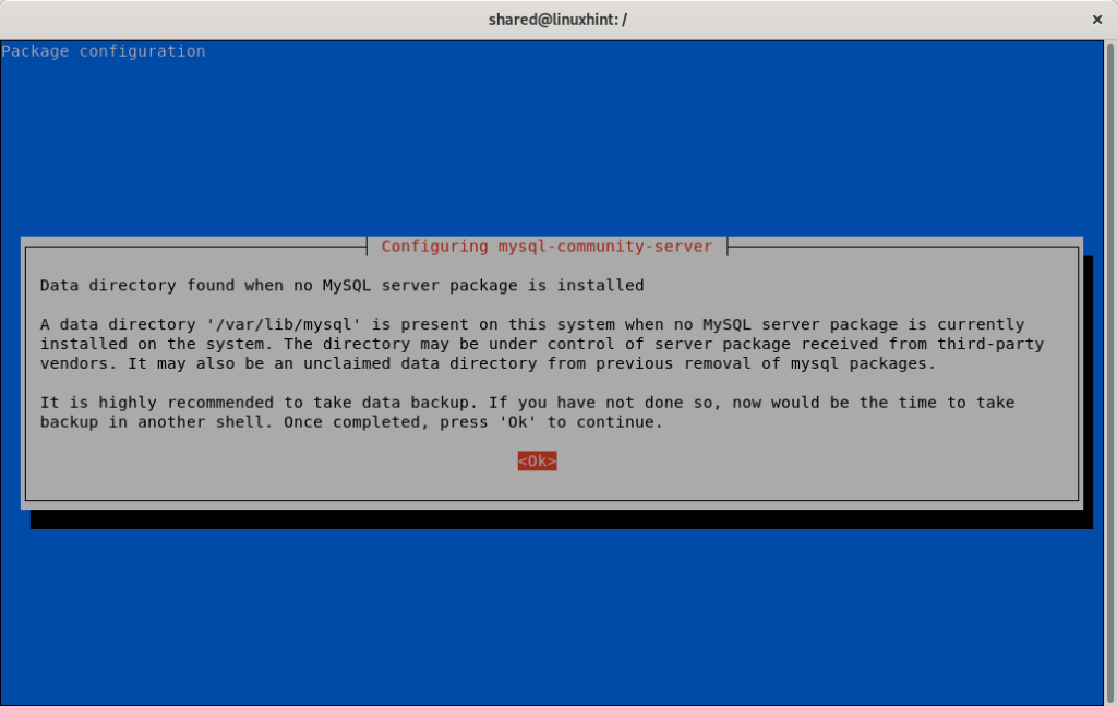 The following warning screen should not prompt to users who had not Mysql installed previously, if you had a working mysql installation you can backup all files before continuing, otherwise you can ignore it and press OK to continue. If you need to backup files then do it on an alternative terminal and then press OK.