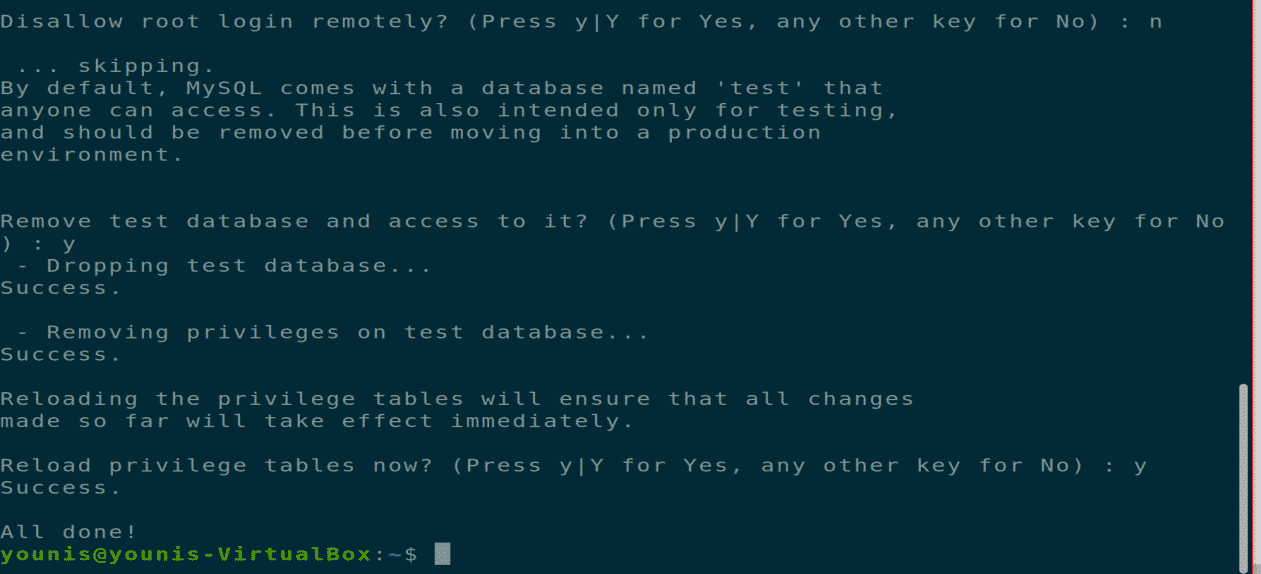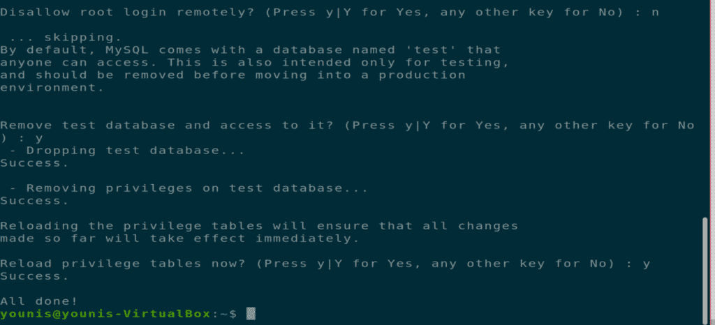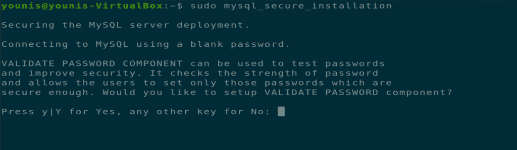 MySQL server package comes with a unique feature called MySQL-Secure-Installation. You have to install it to secure your MySQL server package. Execute the below command to secure your MySQL server from unauthorized root logins locally and remotely.
