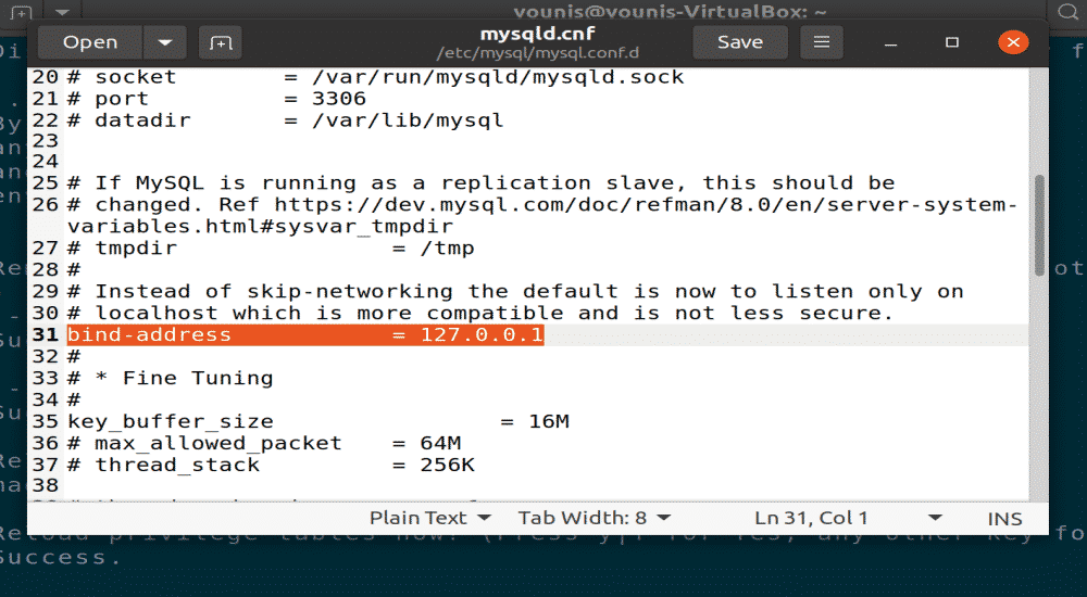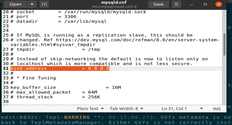When MySQL server installs, it is accessible from a local machine only. You can change this setting in the MySQL configuration file to allow remote access. Enter the following command to open MySQL configuration file in gedit or any other text editor.