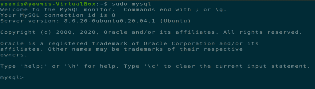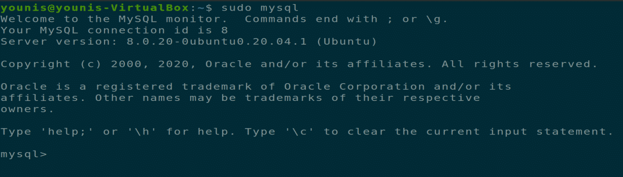 Start MySQL service with root privileges; it opens up the mysql shell.