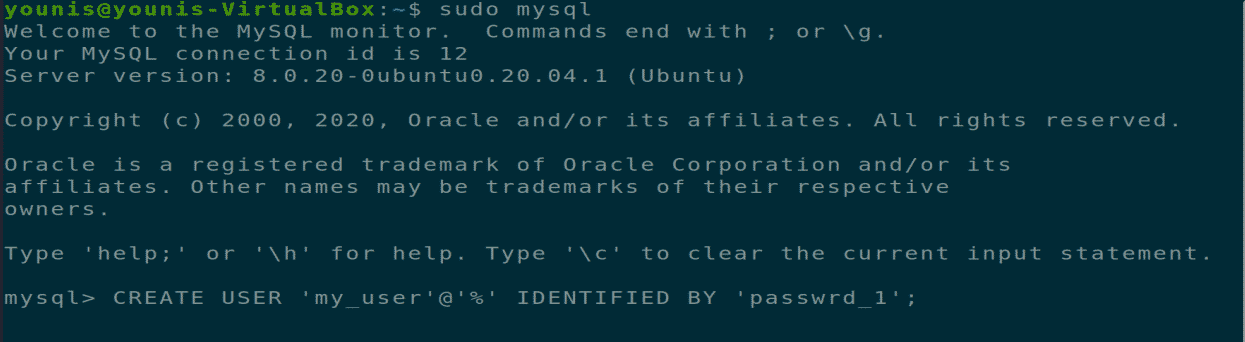 This will create a user account with the login name “my_user” and a password “password_1”, “%” gives allows remote access from anywhere through the internet.