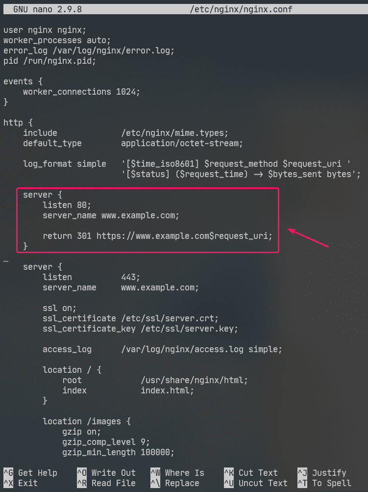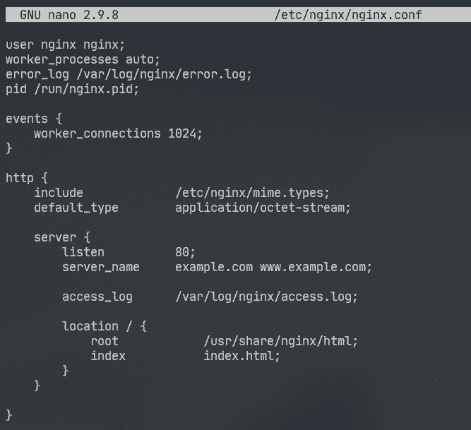 Now, type in the following lines in the /etc/nginx/nginx.conf file and save the file.