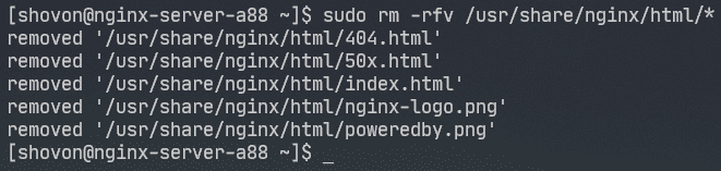 Now, remove all the files from the /usr/share/nginx/html/ directory (web root) as follows: