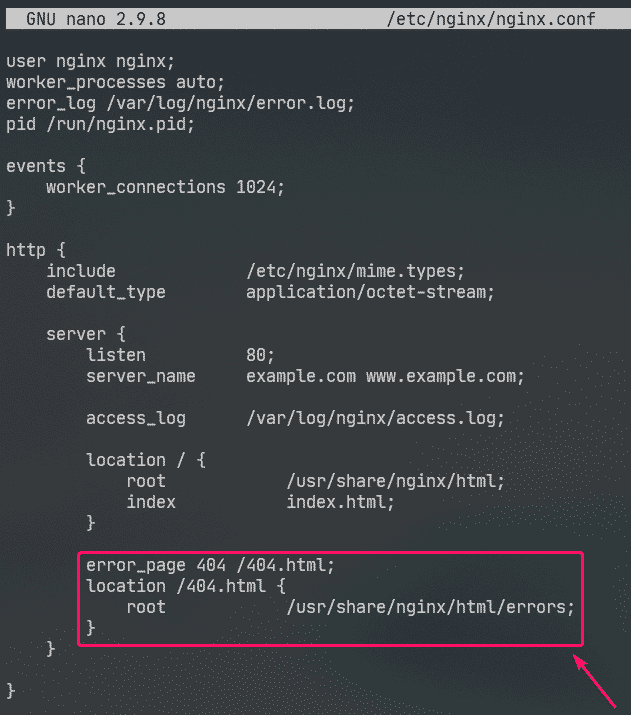 You can also set the same error page for multiple HTTP status codes. For example, to set the same error page /404.html for the HTTP status codes 403 and 404, write the error_page option as follows: