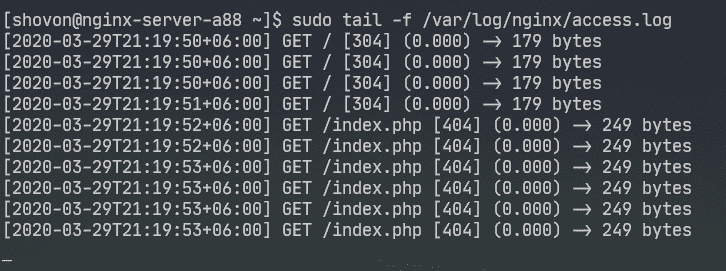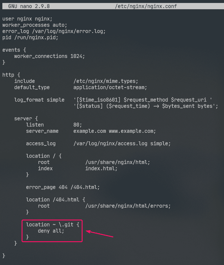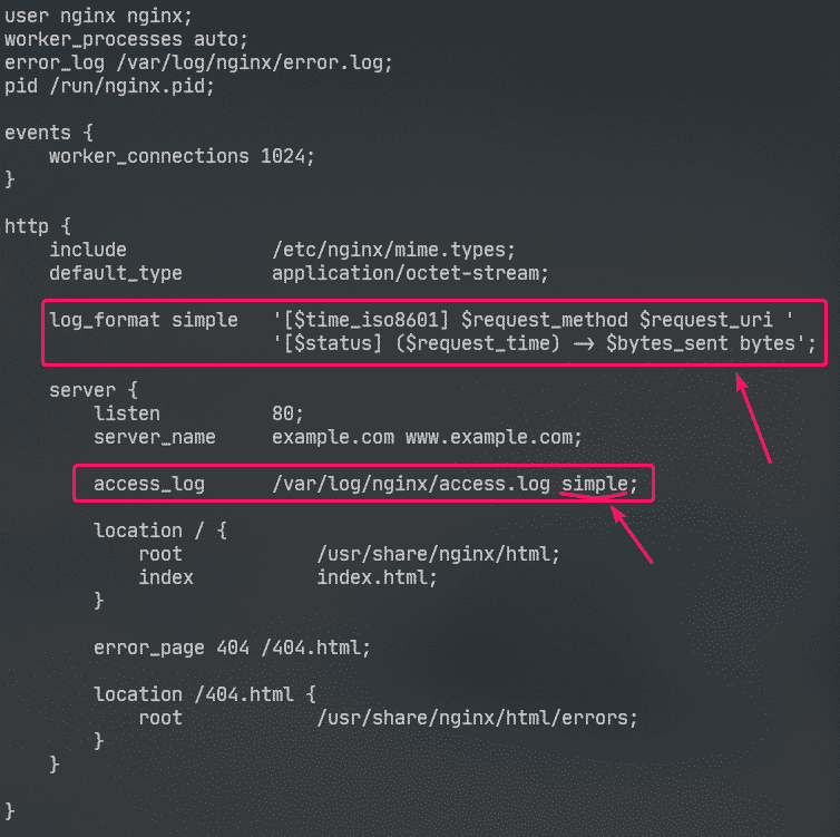 Once the log format simple is defined, access_log option is used to tell Nginx to use it as access log.