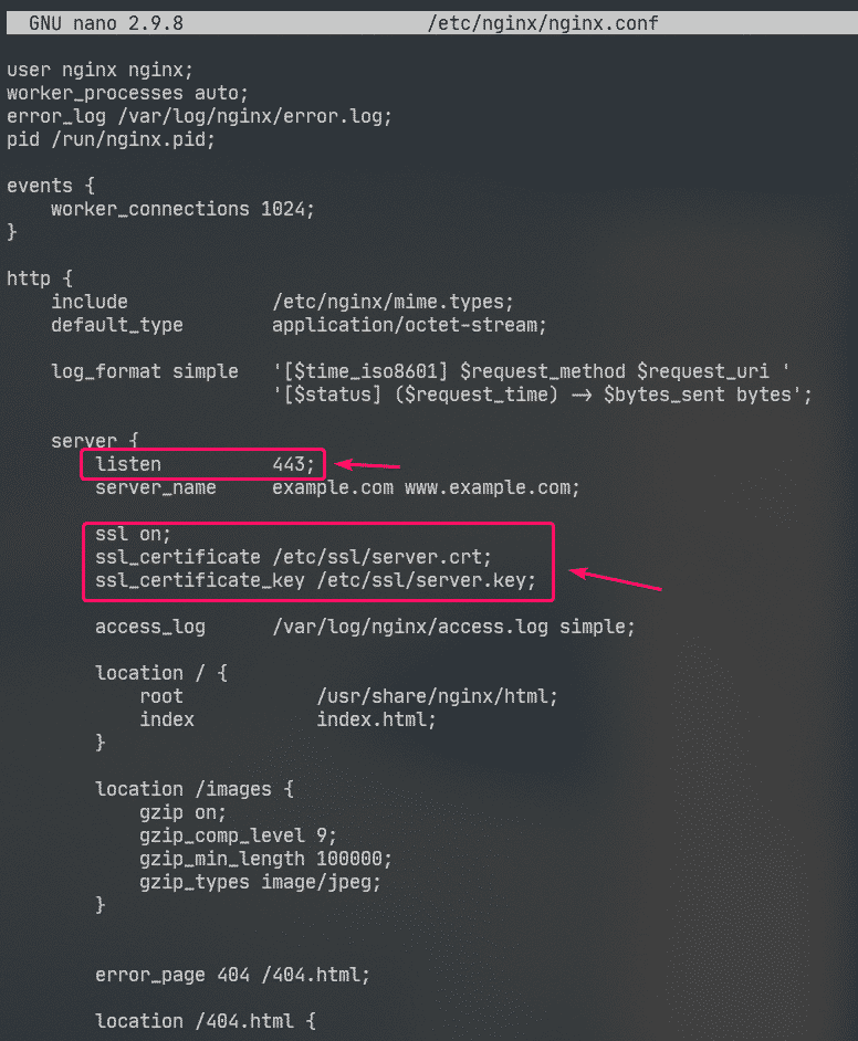 Now, open the Nginx configuration file /etc/nginx/nginx.conf and change listen port to 443 and type in the following lines in the server section.