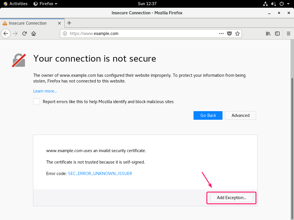 Now, try to visit https://www.example.com and you should see the following page. You will see Your connect is not secure message because it is a self-signed certificate. This is good for testing purpose only.