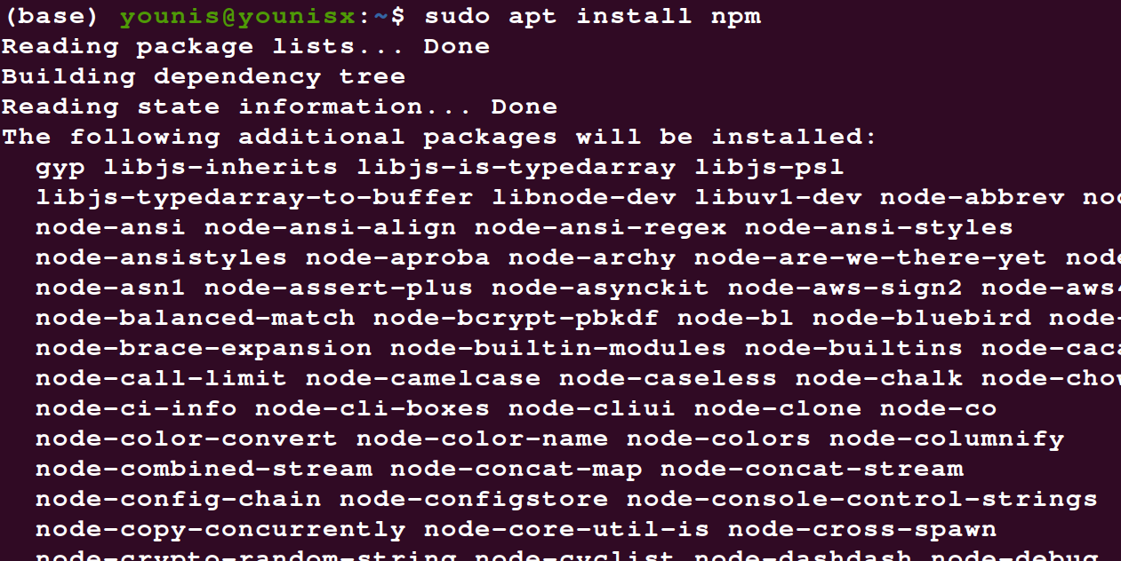 You can install npm just like we installed Node.js with the apt repository. Enter the following command to commence installation of npm: