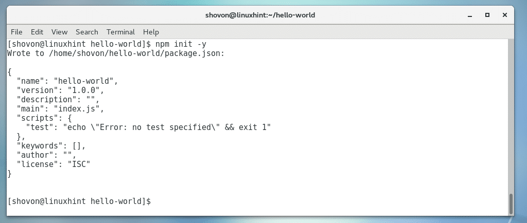 Inside hello-world/ directory, initialize a Node package.json file with the following command:
