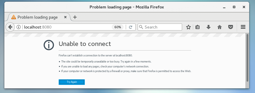 Now if you visit http://localhost:8080 from the web browser, you should see an error.