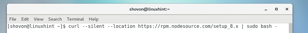 Run the following command to add the package repository of NodeJS 8.x on your CentOS 7 machine: