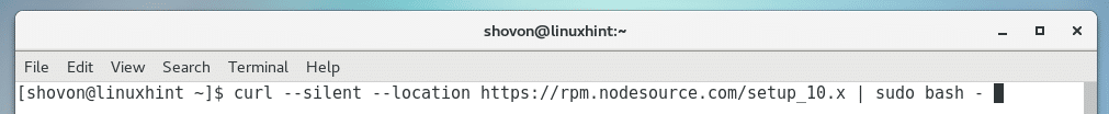 Run the following command to add the package repository of NodeJS 10.x on your CentOS 7 machine: