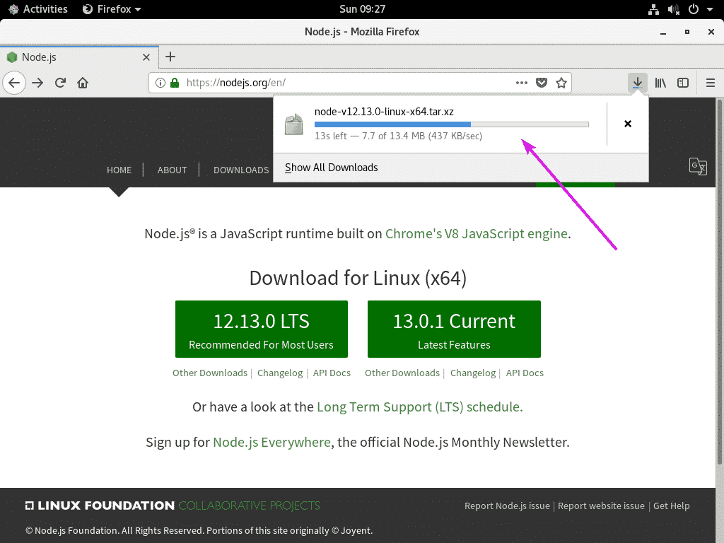 Your browser should start downloading the Node.js archive. It may take a while to complete.