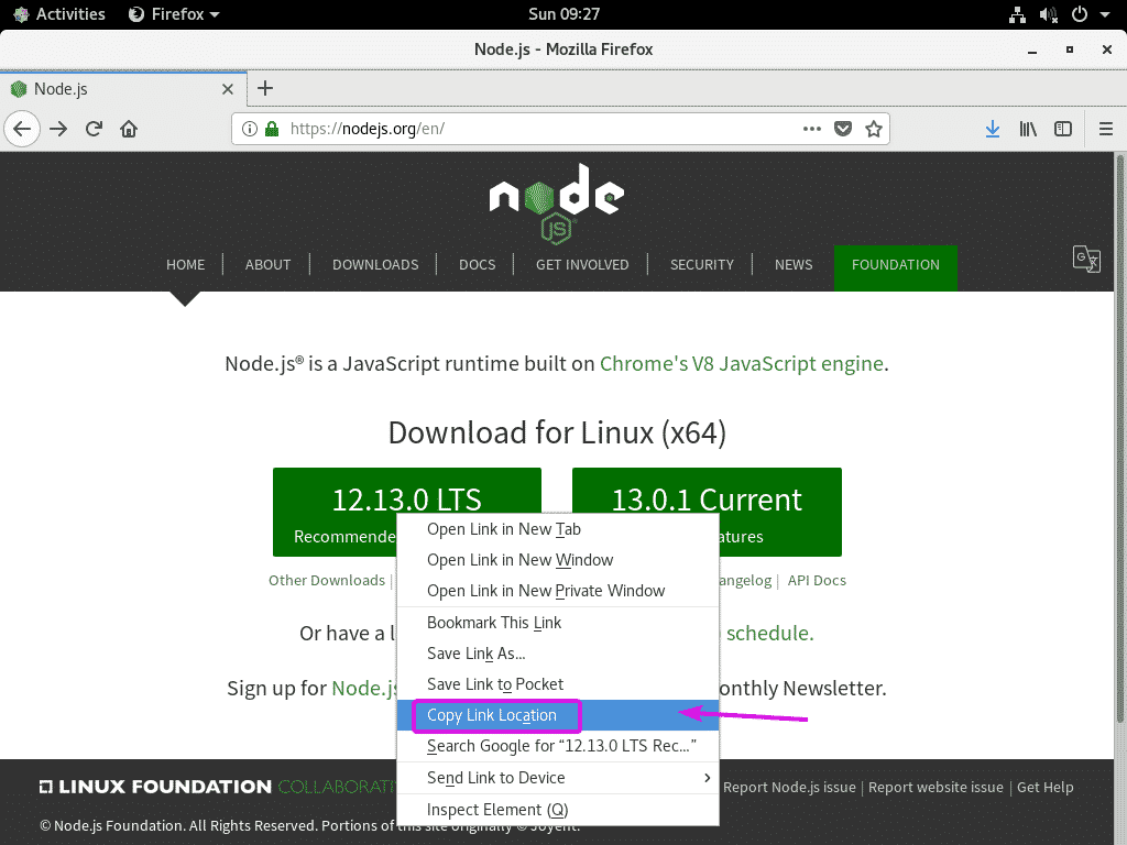 If you’re using a headless version of CentOS 8, then visit the official website of Node.js from any browser. Once the page loads, right click (right mouse click) on the download button and copy the download link.
