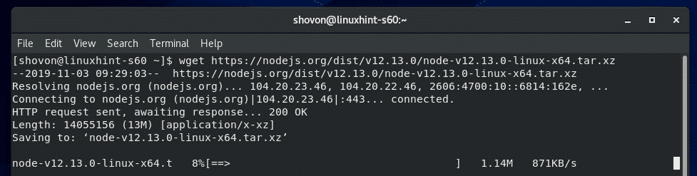 Now, SSH into your CentOS 8 machine and use wget to download the Node.js archive file using the link that you’ve copied earlier as follows: