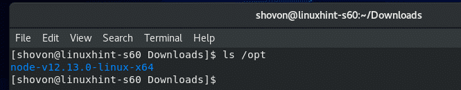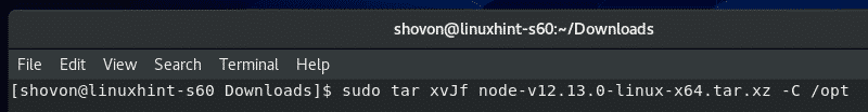 Now, you have to extract the Node.js archive file. I will extract it in the /opt directory. If you want, you can extract it to some other directory. Just replace /opt with the directory path where you want to extract the Node.js archive file.