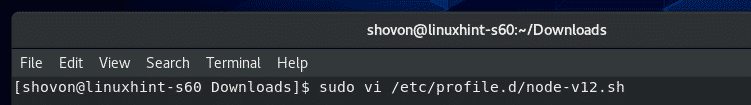 To create a new shell script /etc/profile.d/node-v12.sh, run the following command: