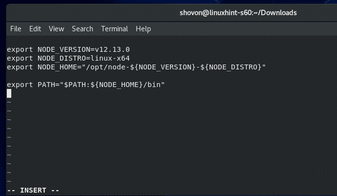 Now, press I to switch to the Vi INSERT mode and type in the following lines of codes in the node-v12.sh file.