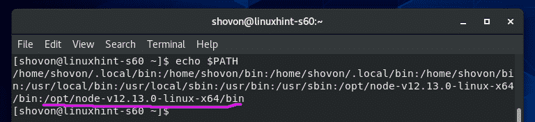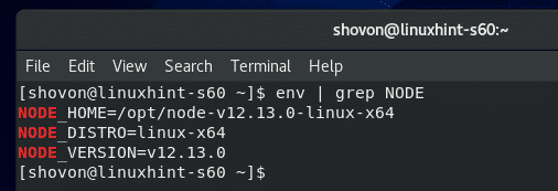 Once your CentOS 8 machine boots, verify whether the shell script set all the Node.js environment variables correctly with the following command: