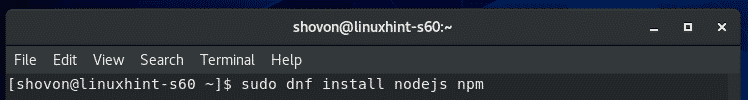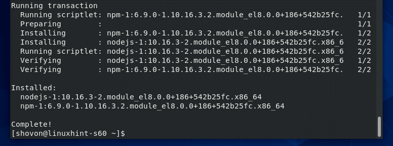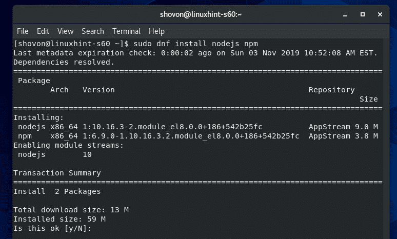 Now, to install Node.js and NPM package manager on CentOS 8 from the official package repository of CentOS 8, run the following command: