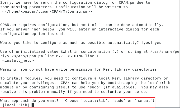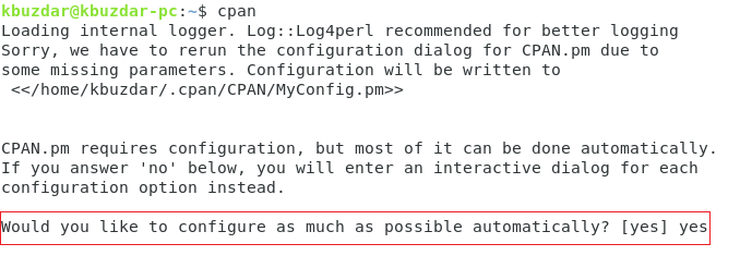 As soon as you try to launch the CPAN interactive shell with the above-mentioned command, you will be asked to configure it. You have to type in “yes” and then press the Enter key as highlighted in the image shown below: