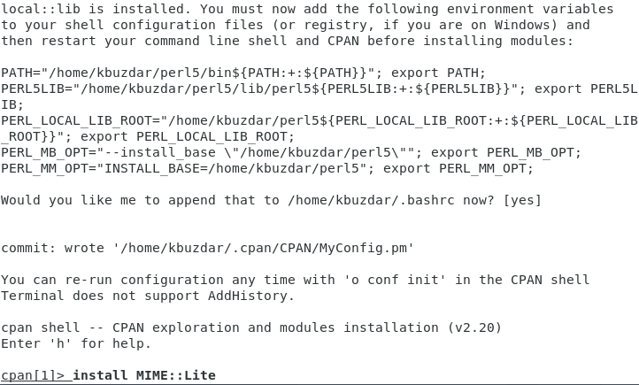 Here, you have to replace ModuleName with the name of the specific module that you want to install via CPAN on your Debian 10 system. For the sake of demonstration, we will be installing the MIME: Lite module, as shown in the image below: