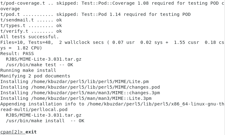 Once the desired module has been installed on your Debian 10 system, your CPAN interactive shell will look something like shown in the following image. In the same manner, you can also install any other Perl module of your choice. Once you are done with the installation, and you want to go back to your regular terminal, you can simply type the “exit” command followed by pressing the Enter key to switch from your CPAN interactive shell to your Debian 10 terminal as shown in the following image: