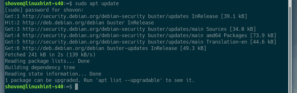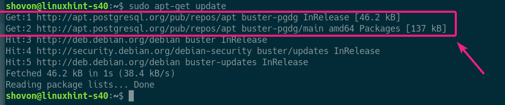 The APT package repository cache should be updated. As you can see, the official package repository of PostgreSQL is in the list. So, the official package repository of PostgreSQL is active.