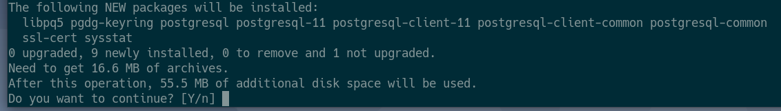 To install the latest stable version of PostgreSQL (PostgreSQL 11 at the time of this writing), run the following command: