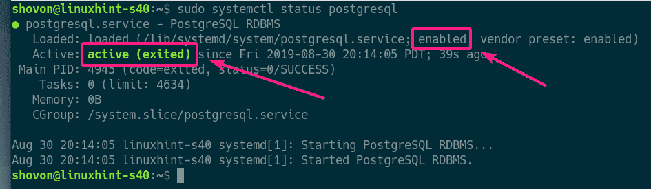 As you can see, postgresql service is active. It’s also enabled to start automatically on system boot.