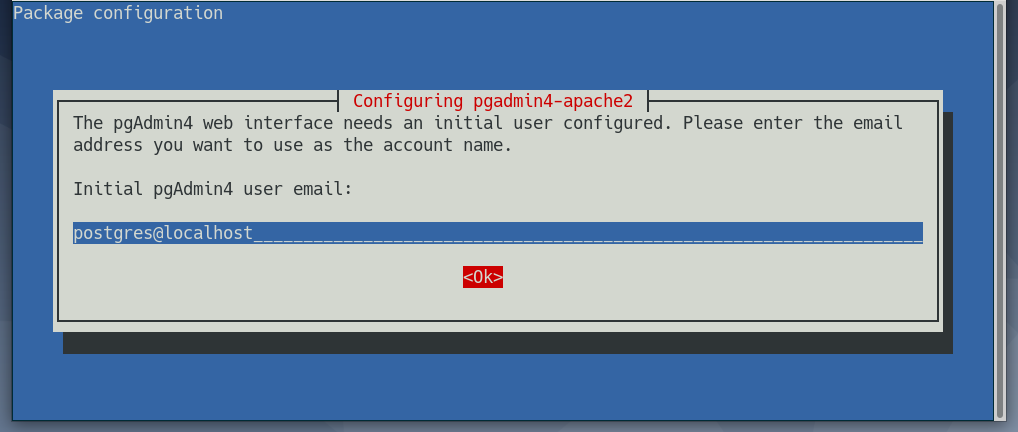 Now, type in an email address for pgAdmin 4 and press <Enter>. You will need this to login to the pgAdmin 4 web interface. If you don’t know what it is, then the default user email [email protected] is fine.