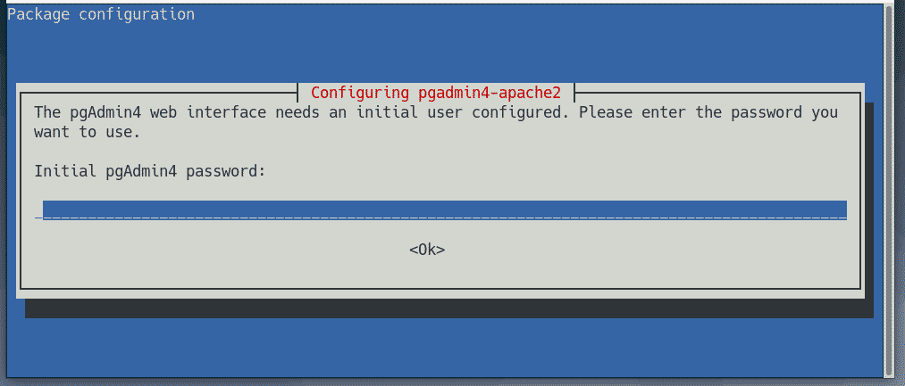 Now, type in a password for the user email of pgAdmin 4 and press <Enter>. Remember the password as you will need it to login to the pgAdmin 4 web interface.