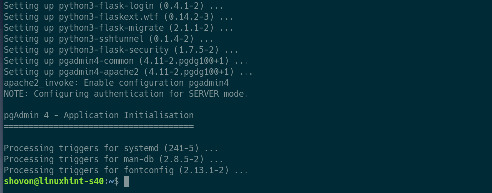 Now, you can install pgAdmin 4 on your Debian 10 machine with the following command: