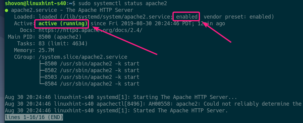 As you can see, the apache2 service is active/running and it’s also enabled to start on system boot automatically.