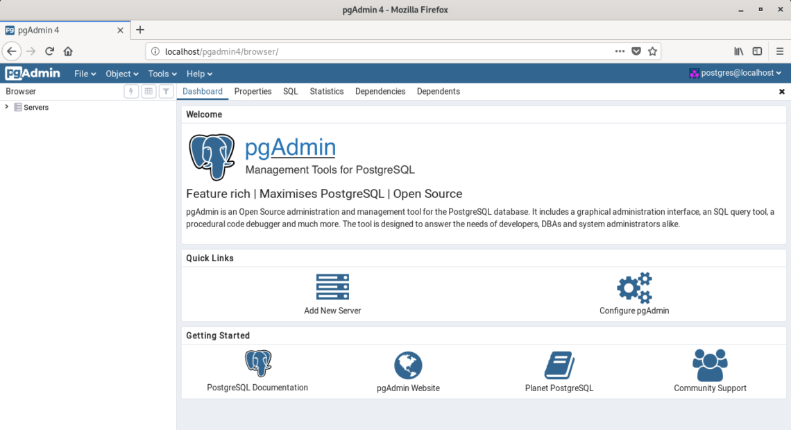 Now, you have to add at least one PostgreSQL database server in order to use pgAdmin 4.