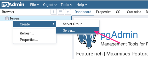 To add a new PostgreSQL database server, right click (RMB) on Servers and click on Create > Server… as marked in the screenshot below.