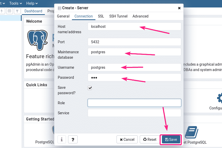 Now, go to the Connection tab and type in the host name or host IP, database name, username and password. If you’ve followed this article to setup a PostgreSQL database server as well, then the hostname should be localhost, and database name and username should be postgres, and the password should be what you’ve set up. Once you’re done, click on Save.