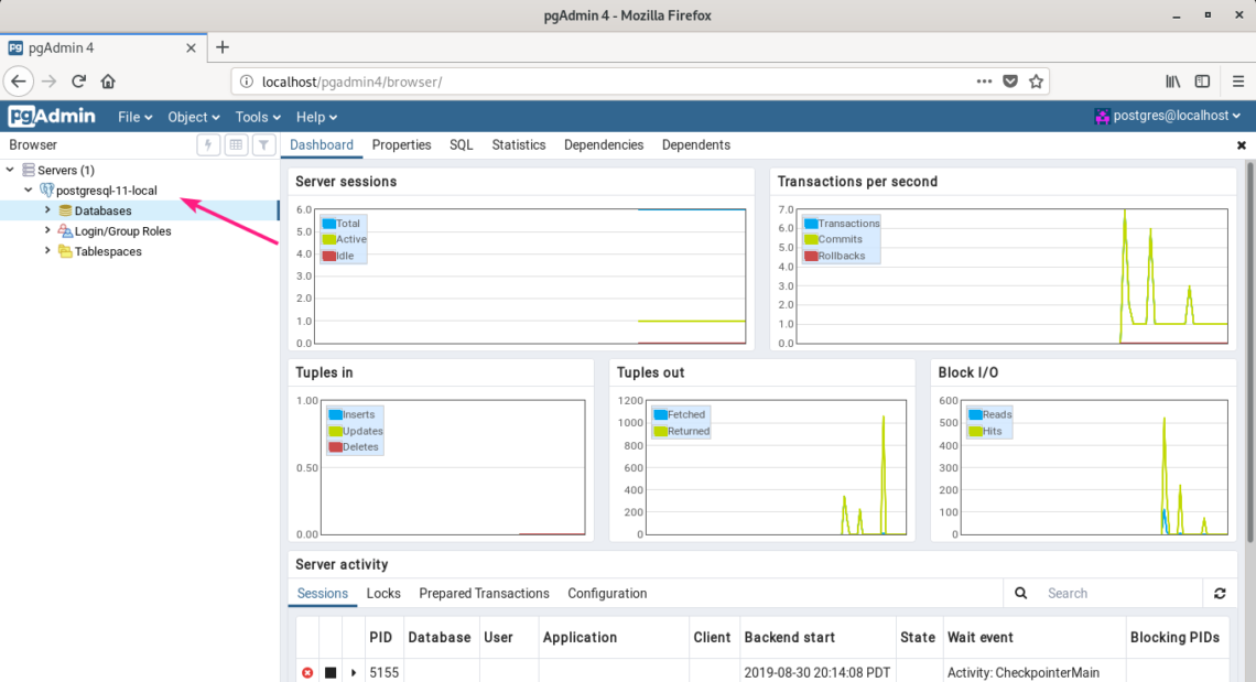 Your desired PostgreSQL database server should be added. Now, you can monitor the database server, create databases, create tables, insert data on tables and so on from the pgAdmin 4 web interface very easily.