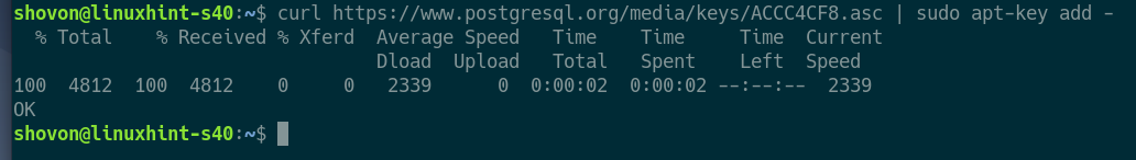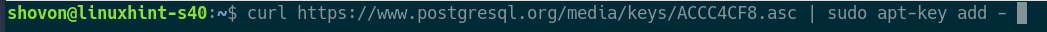 Now, add the GPG key of the PostgreSQL official package repository to the APT package manager with the following command: