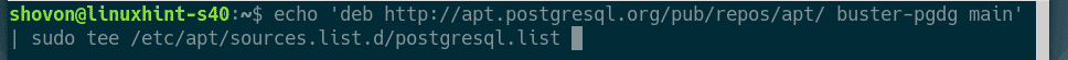 | sudo tee /etc/apt/sources.list.d/postgresql.list