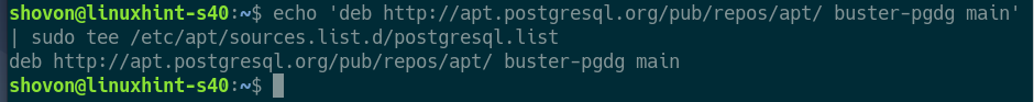 Now, add the official PostgreSQL package repository on your Debian 10 machine with the following command: