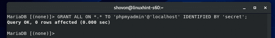 Now, create a new MySQL/MariaDB user phpmyadmin as follows: