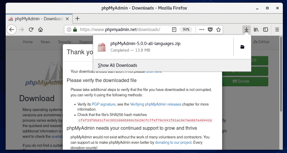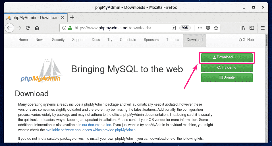 In order to download phpMyAdmin, visit the official phpMyAdmin Downloads Page from your favorite web browser and click on the Download button.