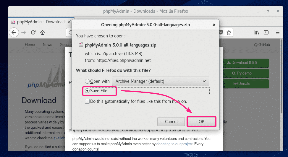 Your browser should prompt you to save the phpMyAdmin archive. Select Save File and click on OK.